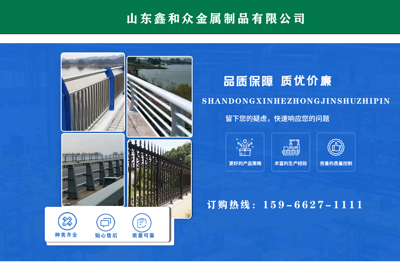 山東鑫和眾金屬制品有限公司主要產(chǎn)品有防撞護(hù)欄,橋梁護(hù)欄,道路護(hù)欄,河道護(hù)欄,不銹鋼護(hù)欄等護(hù)欄。提供設(shè)計方案,一站式定制,包您滿意價格優(yōu)惠,歡迎來電咨詢! 公司常年從事銷售護(hù)欄防撞護(hù)欄,橋梁護(hù)欄,道路護(hù)欄,河道護(hù)欄,不銹鋼護(hù)欄,橋梁鋼護(hù)欄,河道燈光護(hù)欄等。產(chǎn)品廣泛應(yīng)用于橋梁、河道、旅游景區(qū)、道路、公路、公園、小區(qū)、景觀、道路防撞等領(lǐng)域?! 」井a(chǎn)品均采用優(yōu)質(zhì)不銹鋼材料,符合相關(guān)標(biāo)準(zhǔn)。各種型號不銹鋼復(fù)合管及護(hù)欄,質(zhì)量嚴(yán)格把控。產(chǎn)品強度高、耐腐蝕、焊接牢固、抗沖擊、性能好,防撞護(hù)欄結(jié)構(gòu)簡單、美觀實用大方?! g迎前來訂購!...